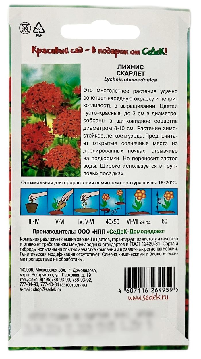 Лихнис СКАРЛЕТ СеДеКЭто многолетнее растение удачно сочетает нарядную окраску и неприхотливость в выращивании. Цветки густо-красные, до 3 см в диаметре собраны в щитковидное соцветие диаметром 8-10 см. Растение зимостойкое, легкое в уходе. Предпочитает открытые солнечные места на дренированных почвах, отзывчиво на подкормки. Не переносит застоя воды. Широко используется в групповых посадках.