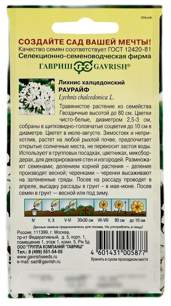 Лихнис халцедонский РАУРАЙФ ГАВРИШТравянистое растение семейства Гвоздичные, высотой до 80-100 см. Цветки чисто белые, диаметром 2.5-3 см, собраны в щитковидно-головчатое соцветие до 10 см в диаметре. Цветет в июле - августе. Зимостоек и неприхотлив, растет на любой рыхлой почве, предпочитает открытые солнечные места, не переносит застоя воды. Используют в групповых посадках, цветниках, миксбордерах, для декорирования стен и изгородей.
