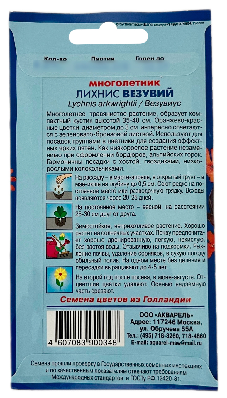 Лихнис ВЕЗУВИЙ АКВАРЕЛЬМноголетнее растение с оранжево-красными цветами на сильно облиственных стеблях. Это необычное по окраске растение наиболее эффектно смотрится в контейнерах и идеально подходит для оформления небольших патио-садиков. Растение невысокое (40 см), кустистое. Бронзово-коричневые листья особенно выразительны в сочетании с яркими, оранжево-красными, крупными цветками, собранными в щитковидные соцветия. Предпочитает солнечные места с хорошо дренированной почвой, зимостойкое, неприхотливое. Используется в групповых и одиночных посадках. На зиму требует легкого укрытия. Семена сеют с марта по июль. Всходы появляются через 20-30 дней при температуре 18-20°C. Сеянцы пикируют в фазе двух настоящих листочков. На постоянное место высаживать осенью или весной. Расстояние между растениями 25-30 см. Для продолжительного и обильного цветения растениям необходим своевременный полив, регулярная прополка, рыхление и подкормка минеральными удобрениями.