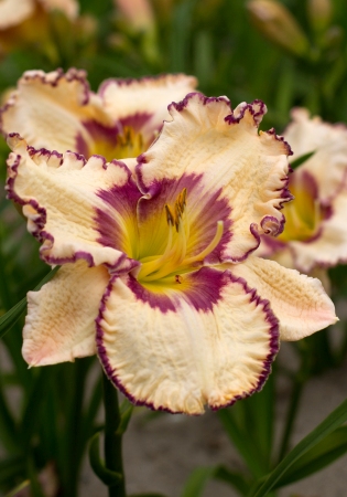 Лилейник Антик Линен. Светло-лососевый с пурпурной каймой и кольцом, горло желтое. Цветок — 18 см. Высота растения 70 см.Характеристики