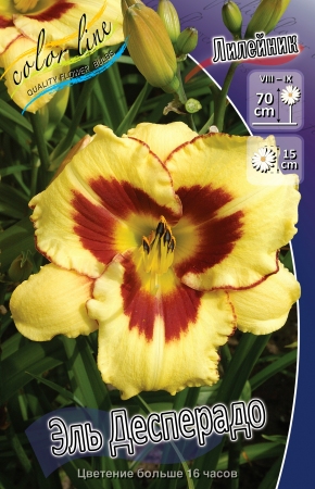 Лилейник «El Desperado» – 70 сантиметров высоты, цветки до 13 сантиметров в диаметре, солнечно-желтые с винно-вишневой каймой и зеленовато-желтым крупным горлышком.Характеристики