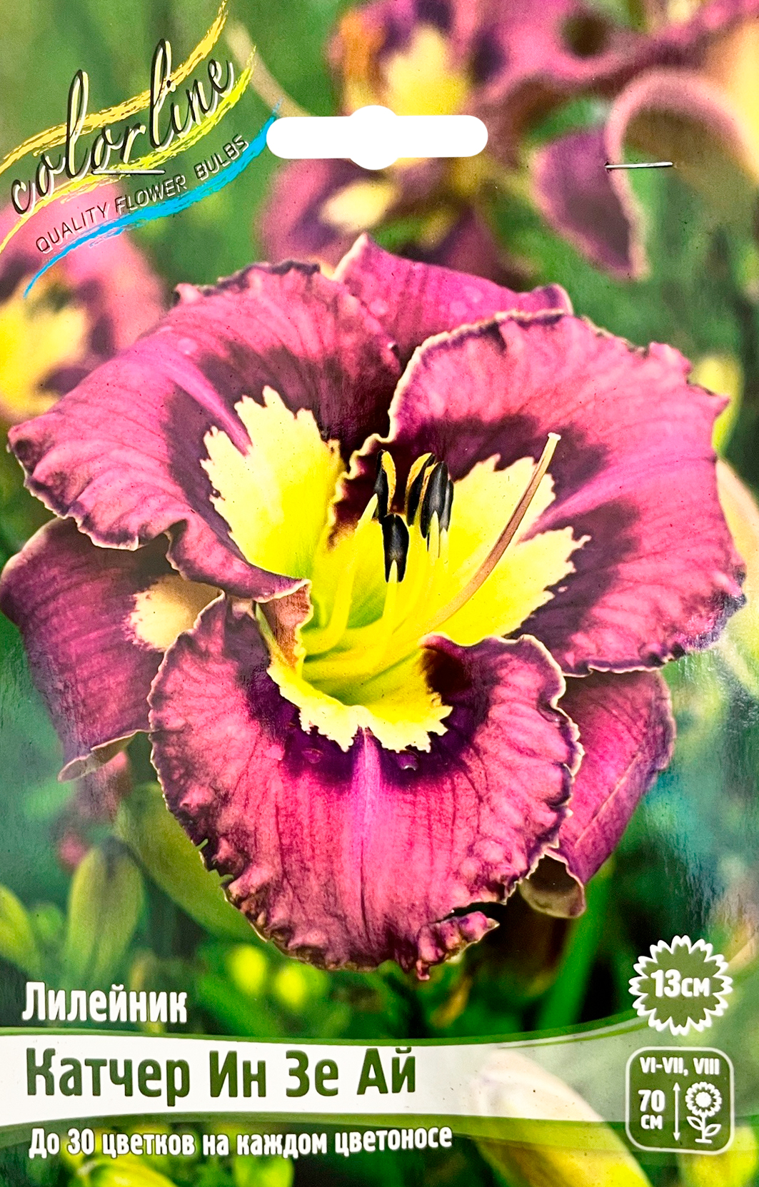 Лилейник Катчер Ин Зе Ай Hemerocallis Catcher in the EyeЦветок диаметром 13 см, яркого лавандово-фиолетового цвета с жёлтым горлом и тёмно-фиолетовым гало. Цветение обильное, в июне-июле, в благоприятных условиях может цвести повторно в конце лета – начале осени. На каждом цветоносе образуется до 30 цветков. Высота 75 см.