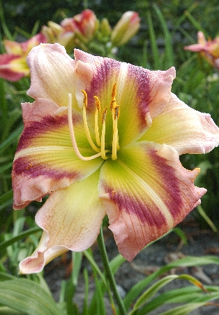 палево-розовый с лилово-розовым кольцом и желтым горлом, высота-55 cм, диаметр цветка 15 cм, цветение июль-август, более 400 цветков за сезон у трехлетнего растенияХарактеристики