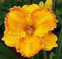Очень эффектный яркий лилейник с крупными цветкми желто-оранжевого цвета, с ещё более темным кольцом вокруг зеленого горла. Кайма лепестков сильно гофрированная. Высокая устойчивость к непагоде. Высота 65 см., цветок 15 см.Характеристики