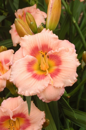 лососево-розовый с ярко-коралловым пятном и желтым горлом, высота 60см, Ø 10см, цветение июль, август.Характеристики