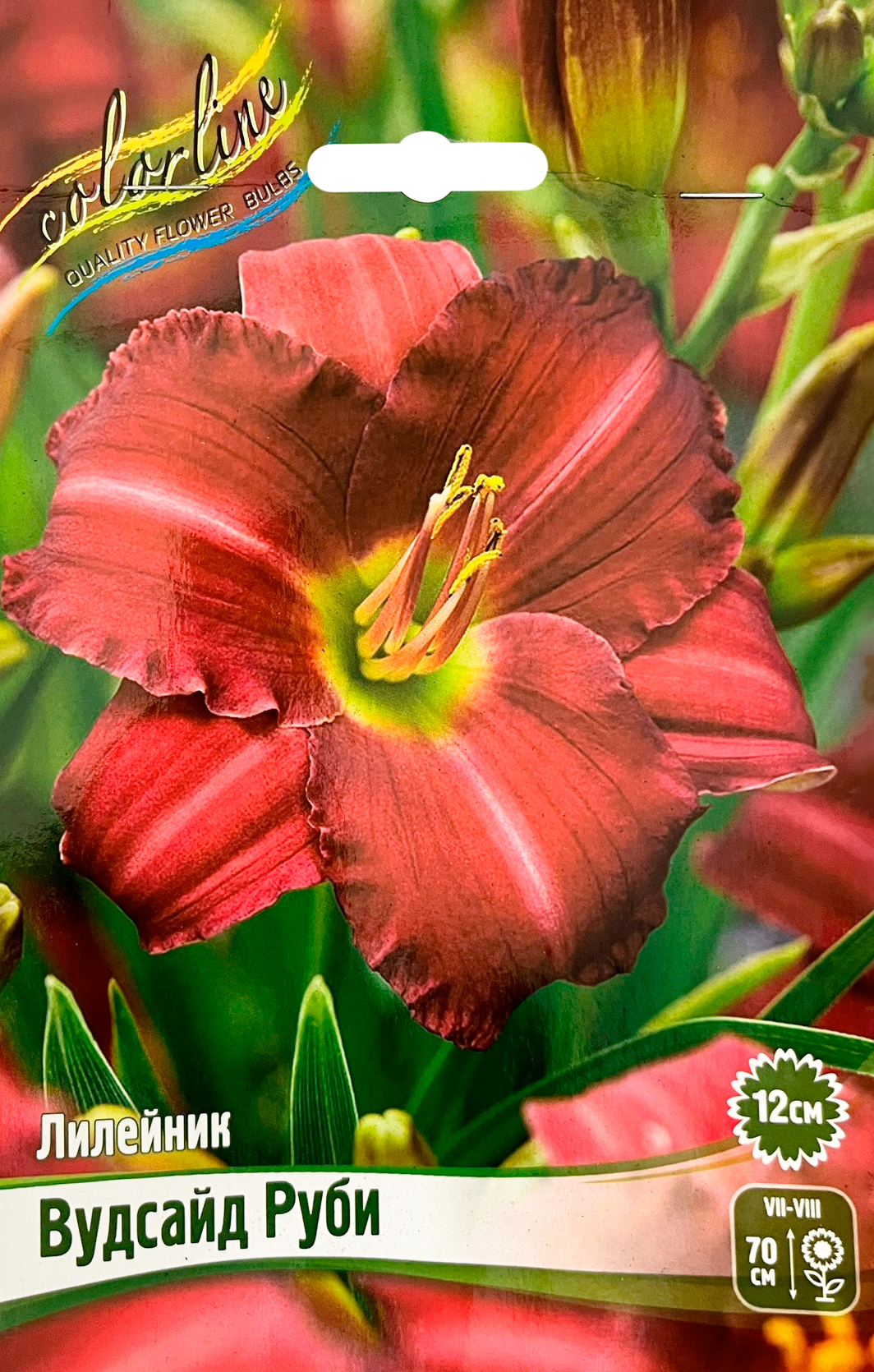 Лилейник Вудсайд РубиРубиново-красный с зеленовато-желтым горлом. В разгар цветения высокий зеленый куст густо покрывается бархатными рубиновыми цветками с высветвленными центрами лепестков и защипами по краям. Высота: 75-85 см, цветение: июль, диаметр цветка: 13 см.