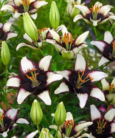 Очень яркая и контрастная азиатская лилия Black Eye способна вскружить голову каждому садоводу. Купив луковицы лилии Блэк Ай, Вы украсите любой уголочек Вашего дома или сада. Ознакомиться с кратким описанием и фото Вы сможете в нашем каталоге.Период цветения приходится на июнь-июль, расцветая восхитительными двухцветными крупными цветами, лилия Блек Ай преображает клумбу, придавая ей изюминку. Кончики лепестков окрашены в ослепительно белый оттенок, а сердцевина в насыщенный бордово-черный цвет с очень густым темно-коричневым крапом. Диаметр цветка достигает 12-15 см, аромат тонкий, едва уловимый. Цветение обильное и продолжительное, бутоны один из другим распускаются на прочных стеблях, радуя цветами до2-4 недель.