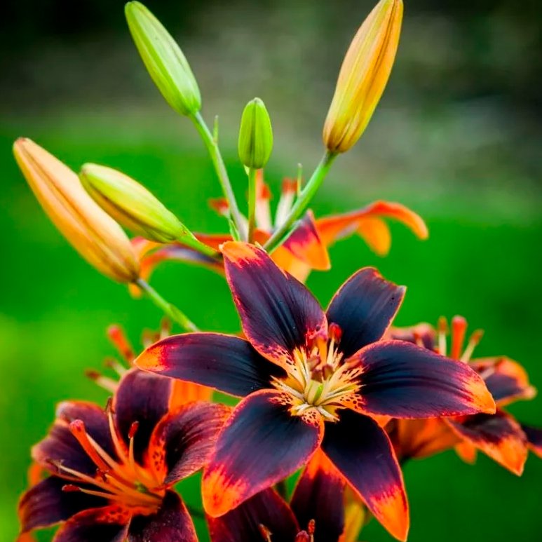 Главная цветовая гамма этой культуры – оранжевая и бордовая. Цветонасыщенность лепестков – яркая, они считаются двухцветными. Светлый центр и наличие крапинок сочетаются с отсутствием окантовки – она для сорта Форевер Сьюзан вряд ли улучшила бы и преобразила его вид. Немахровые лепестки немного загибаются назад, в сторону цветоносов. Поверхность лепестков – блестящая, она сочетается с тонкими тычинками, распространяющими бордовую пыльцу. Аромат нерезкий, но достаточно отчётливый.