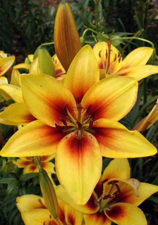 Цветет этот сорт в середине июля. На стебле высотой до 120см образуется до 7 цветков направленных вверх диаметром около 15 см. Лепестки не отгибаются, размером в среднем 85мм на 40мм, желтые, с красно-коричневым основанием и пыльниками.Характеристики