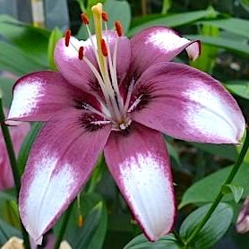 Шесть оранжевых тычинок придают игривости лилии. Лепестки полностью раскрывшегося цветка развернуты наружу и немного загнутые по краям. У такого взрыва цвета, пестроты и экспрессии невозможно пройти и не остановиться. Поселите в своем саду звезды.