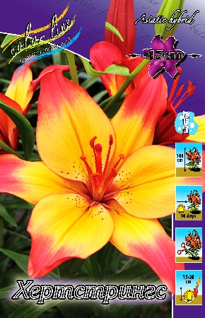 Высота растения 80 см. Цветок двухцветный — желтый с красным.Азиатские гибриды — наиболее приспособленные к условиям Средней полосы России лилии. Сорта этой группы имеют наибольшее разнообразие по окраске, строению цветков, по высоте и срокам цветения. У них, за исключением единичных сортов, отсутствует аромат. Ассортимент этой группы очень обширен.