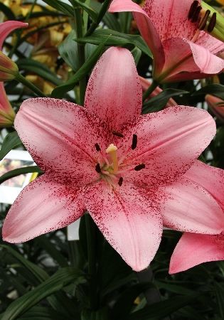 Лилия Коголето 5464 COGOLETOНОВИНКА СЕЛЕКЦИИ Нежно-розовая с темно-красным напылением по центру и краям лепестков. Очень эффектная. . Диаметр цветка 20 см, высота 110 см. ЛА-гибриды предпочитают солнечное или полутенистое место, плодородную хорошо дренированную почву, хорошо зимуют в Подмосковье, цветут в середине лета после азиатских лилий.