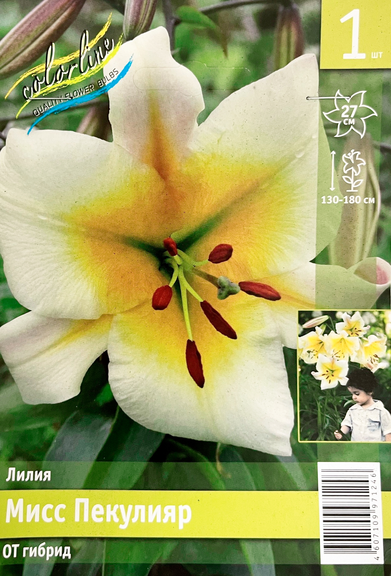 Лилия ОТ гибрид Miss Peculiar (Мисс Пекулияр)Поражает красотой гигантских цветков! Элегантные кремовые бутоны трубчатой формы венчают мясистые прямые стебли. Помимо невероятных внешних качеств, лилия также славится сладким насыщенным ароматом. Лепестки отогнуты назад, раскрывая сердцевину цветка и показывая тяжелые оранжевые пыльники. Сорт подойдет для выращивания в саду и под срез, однако перед добавлением в букеты пыльники рекомендуется срезать, чтобы яркая пыльца не пачкалась.