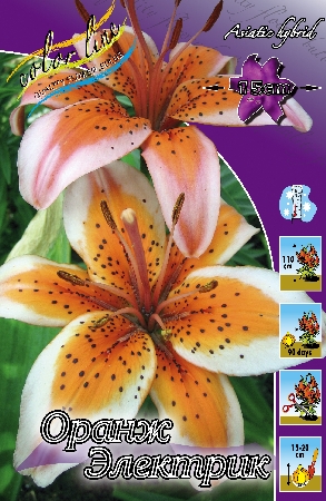 Лилия Оранж Электрик относится к азиатским гибридам. Цветы белые с яркими оранжевыми мазками. Очень нарядный и неприхотливый сорт с необычной окраской цветков. Диаметр цветка: 11-15 см. Начало цветения приходится на первую декаду июля. Зимостойка, вынослива, неприхотлива в культуре, хорошо растет как на солнечных открытых участках, так и в полутени.Характеристики
