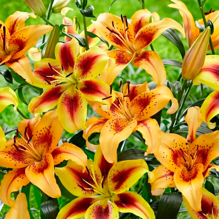 Лилия Отель КалифорнияЛуковицы лилии ОА-гибрид Отель Калифорния были получены путем скрещивания лучших азиатских и восточных гибридов. Сортовая серия «ОА» считается одной из самых перспективных, так как включает множество лилий разных оттенков. Данный сорт характеризуют крупные, до 20 сантиметров в диаметре, цветки желто-оранжевого цвета с небольшим, как будто небрежно созданным художником красным мазком посередине. Всю внутреннюю часть лепестков покрывает густой крап более темного цвета. Высота взрослого растения составляет 110 сантиметров, поэтому лилию лучше высаживать одиночно или на задних планах смешанных клумб.