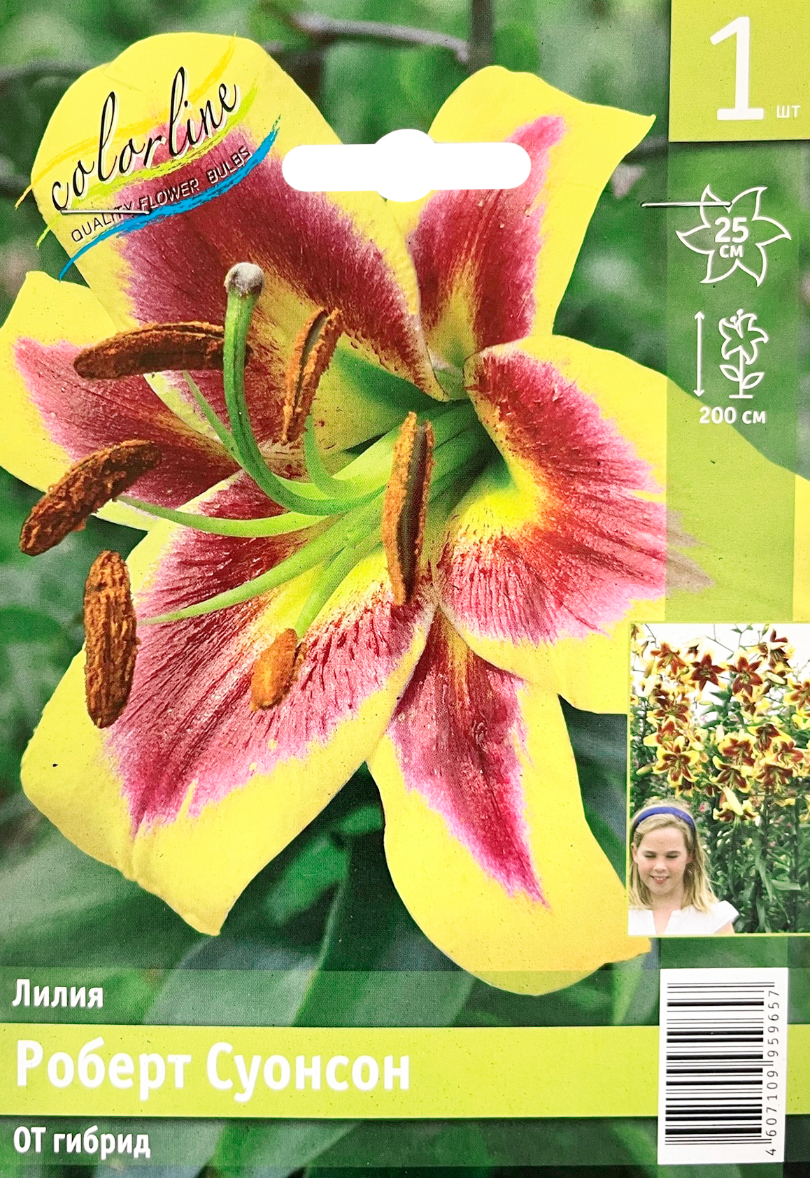 Лилия Роберт СуонсонРастение достаточно высокое, более 150-180 см. Листья имеют ланцетную форму. Крупноцветковый сорт обладает пестрой расцветкой.