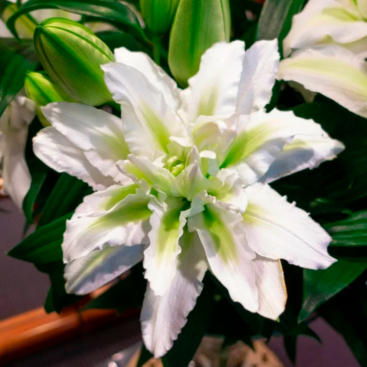 Лилия Роселили АишаЛилия восточная Roselily Aisha характеризуется чрезвычайно быстрым ростом, и красивыми огромными цветками. Цветки при этом у сорта махровые, в форме чаши, а их окрас белый с зеленоватыми полосами и гофрированными лепесткам. Сорт прекрасно подойдет как для срезки и групповых посадок, так и одиночных посадок. Roselily Aisha устойчива к грибным заболеваниям, зимостойкая. Посадка лилии: Глубина посадки лилии зависит от почвы. Если почва легкая – можно углубить на 12-13 см, что составляет 3-4 диаметра луковицы. Если же почва глинистая или тяжелая, достаточно двух диаметров, глубина лунки не более 5 см. В выкопанную ямку насыпьте слой песка, установите луковицу донышком на песок, присыпьте сверху остатками грунта, сверху замульчируйте.