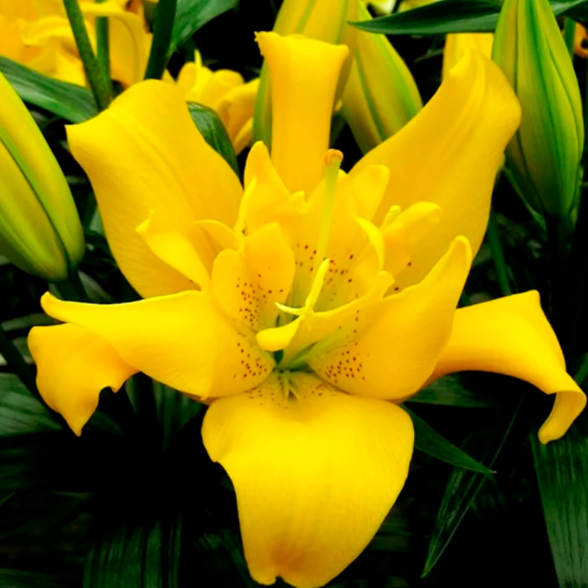Лилия СандьюАзиатские гибриды – неприхотливые, выносливые растения, отличаются морозостойкостью, быстро и легко размножаются. Цветки разнообразны по форме и окраске. Цветут во второй половине июня-июле. Пригодны для выгонки во внесезонное время. Аромат отсутствует. Зимостойкость хорошая.