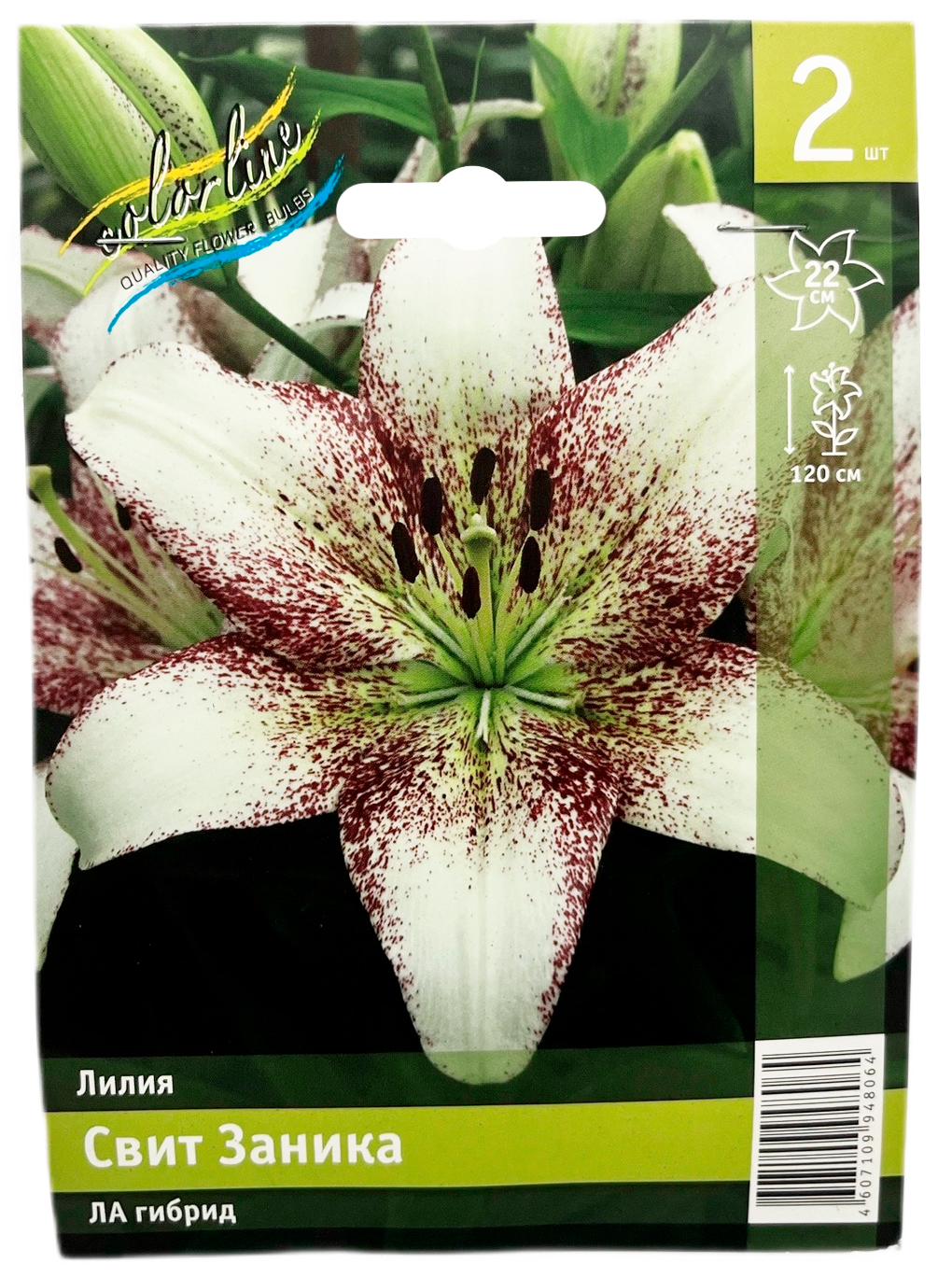 Лилия Свит Заника ЛА ГИБРИДОтносится к виду (LA) гибридов. Цветок диаметром до 22 см, белый с пурпурным крапом, удлиненной формы, растущие вверх и в сторону. Зацветает в конце июня-первой половине июля. Высота растения до 120 см.