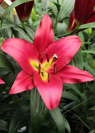 Цветок яркий, пурпурно- красного цвета с желто-зеленым горлом,диаметром 25-30см, душистые.Характеристики