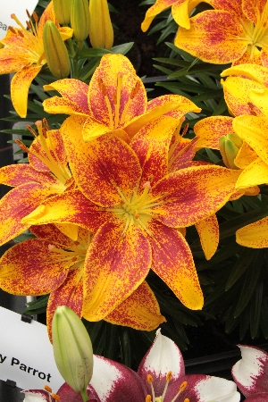 Относится к виду Азиатских низкорослых гибридов. Цветки крупные, диаметром 16 см, гранатовые с редкими чёрными крапинками. Лилия зацветает в конце июня-первой половине июля. Высота растения 45 см. Время посадки осенью - август-сентябрь или весной - в мае. Глубина посадки - 15-20 см. Расстояние между луковицами - 25-35 см. Расположение для посадки - открытые и затенённые места. Растение требует укрытия в первый год. Предпочитает нейтральную или слабокислую, хорошо дренированную почву. Лилия Тайни Пэррот неприхотливая, устойчивая к грибным заболеваниям, зимостойкая. Размножается луковичками - детками и луковичными чешуйками.Характеристики