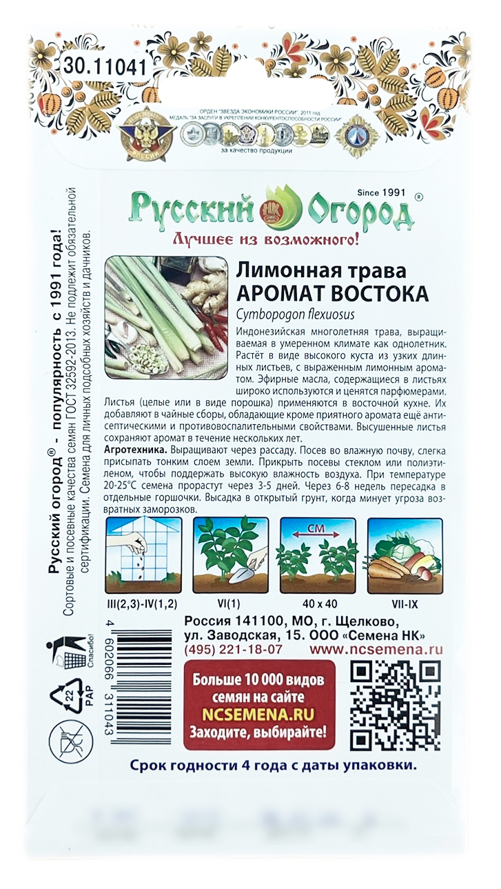 Лимонная трава АРОМАТ ВОСТОКА Русский ОгородИндонезийская многолетняя трава, выращиваемая в умеренном климате как однолетник. Растёт в виде высокого куста из узких длинных листьев, с выраженным лимонным ароматом. Эфирные масла, содержащиеся в листьях широко используются и ценятся парфюмерами. Листья (целые или в виде порошка) применяются в восточной кухне. Их добавляют в чайные сборы, обладающие кроме приятного аромата ещё антисептическими и противовоспалительными свойствами. Высушенные листья сохраняют аромат в течение нескольких лет.