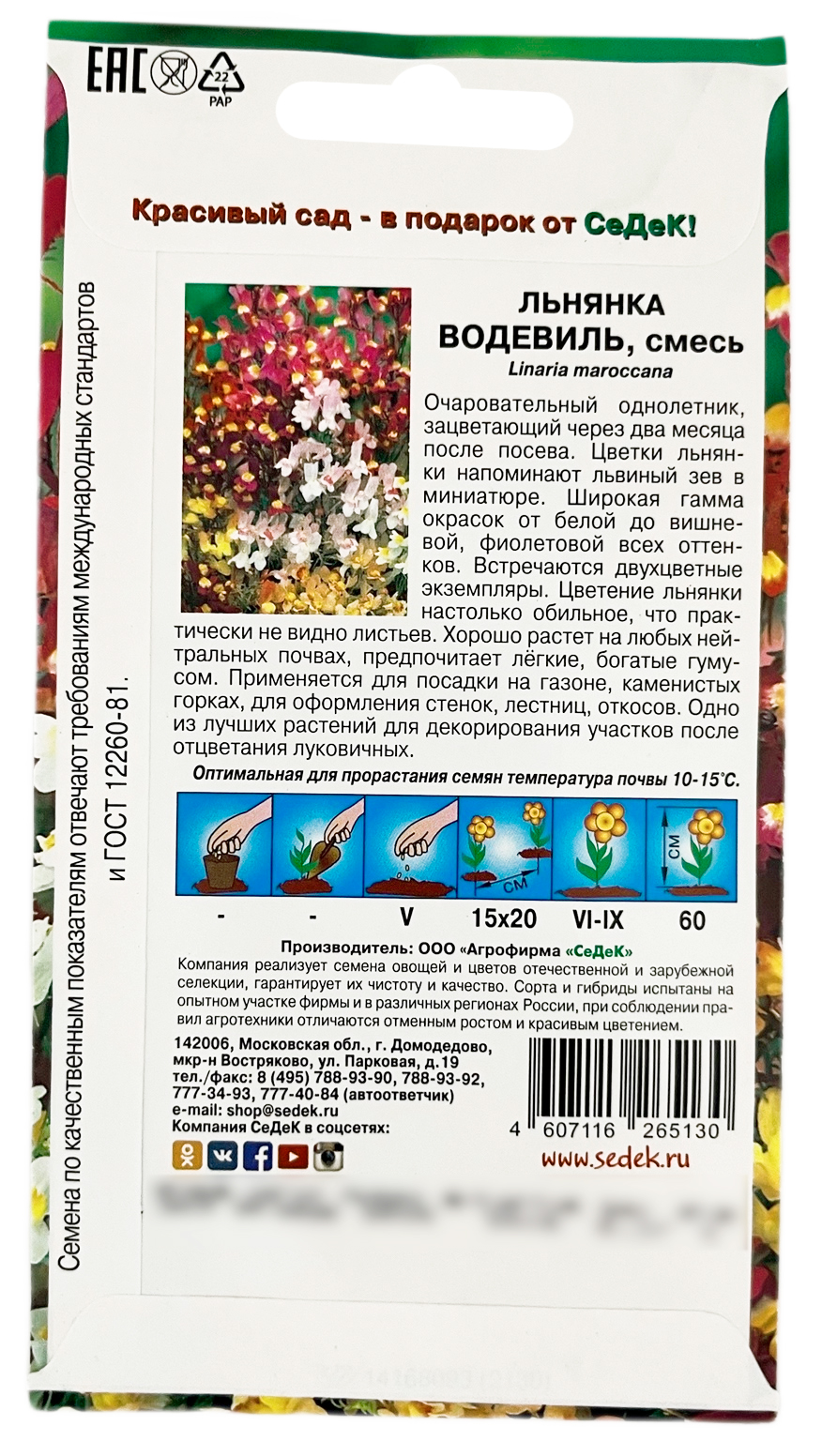 Льнянка ВОДЕВИЛЬ смесь СеДеКОчаровательный однолетник, зацветающий через два месяца после посева. Цветки льнянки напоминают львиный зев в миниатюре. Широкая гамма окрасок от белой до вишнёвой, фиолетовой всех оттенков. Встречаются двухцветные экземпляры. Цветение льнянки настолько обильное, что практически не видно листьев. Хорошо растёт на любых нейтральных почвах, предпочитает лёгкие, богатые гумусом. Применяется для посадки на газоне, каменистых горках, для оформления стенок, лестниц, откосов. Одно из лучших растений для декорирования участков после отцветания луковичных.