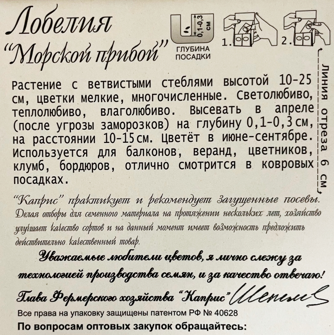 ЛОБЕЛИЯ МОРСКОЙ ПРИБОЙ (ГЕРМАНИЯ)Ветвистое растение до 10-25см. Светолюбиво, теплолюбиво, влаголюбиво. Высевать в апреле (после угрозы заморозков) на глубину 0,1-0,3см,на расстояние 10-15см. Цветёт в июне-сентябре. Используется для клумб, веранд, цветников, балконов.