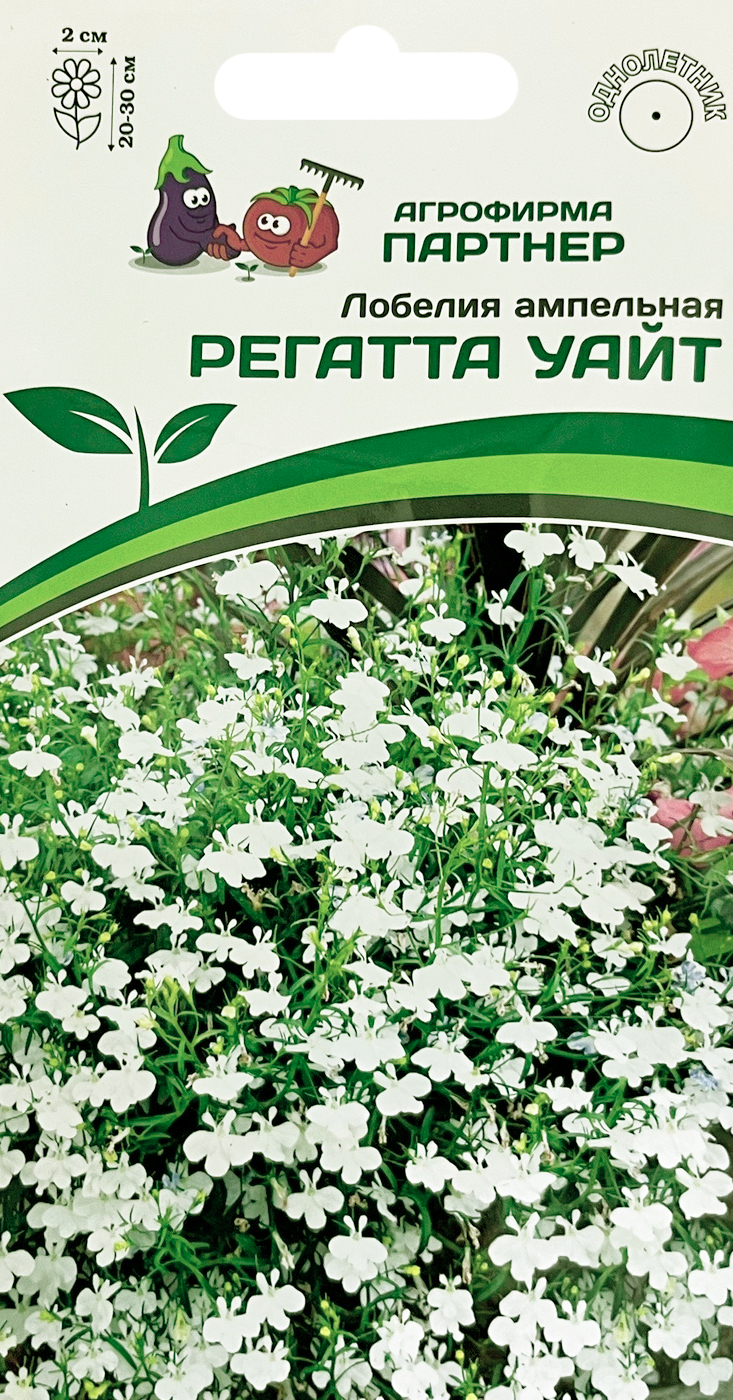 Лобелия ампельная Регатта уайтИменно сейчас «висячие сады», как часть модного вертикального обустройства, переживают настоящий бум! Каскадная лобелия «Регатта» станет акцентом в смешанных композициях и придаст им определенную завершенность. И это понятно, ведь облако белоснежных цветков на живописно ниспадающих побегах вместе создают красивую, орнаментальную игру и ласкают взгляд. Она готова без устали баловать своим цветением до устойчивых заморозков. Конечно же, самая известная парочка это «лобелия + петуния», когда трогательная лобелия подчеркивает неотразимый наряд петунии. Все это делает ее превосходным кандидатом при оформлении балконных контейнеров, подвесных кашпо, высоких вазонов и грунтовых цветников! Кроме того, это один из лучших летников для оформления не только солнечных, но и тенистых цветников.