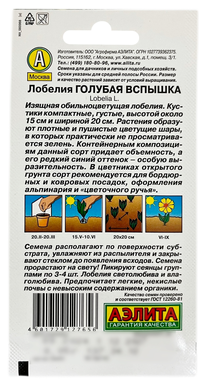 Лобелия ГОЛУБАЯ ВСПЫШКА АЭЛИТАИзящная обильноцветущая лобелия. Кустики компактные, густые, высотой около 15 см и шириной 20 см. Растения образуют плотные и пушистые цветущие шары, в которых практически не просматривается зелень. Контейнерным композициям данный сорт придает объемность, а его редкий синий оттенок – особую выразительность. В цветниках открытого грунта сорт рекомендуется для бордюрных и ковровых посадок, оформления альпинария и «цветочного ручья».