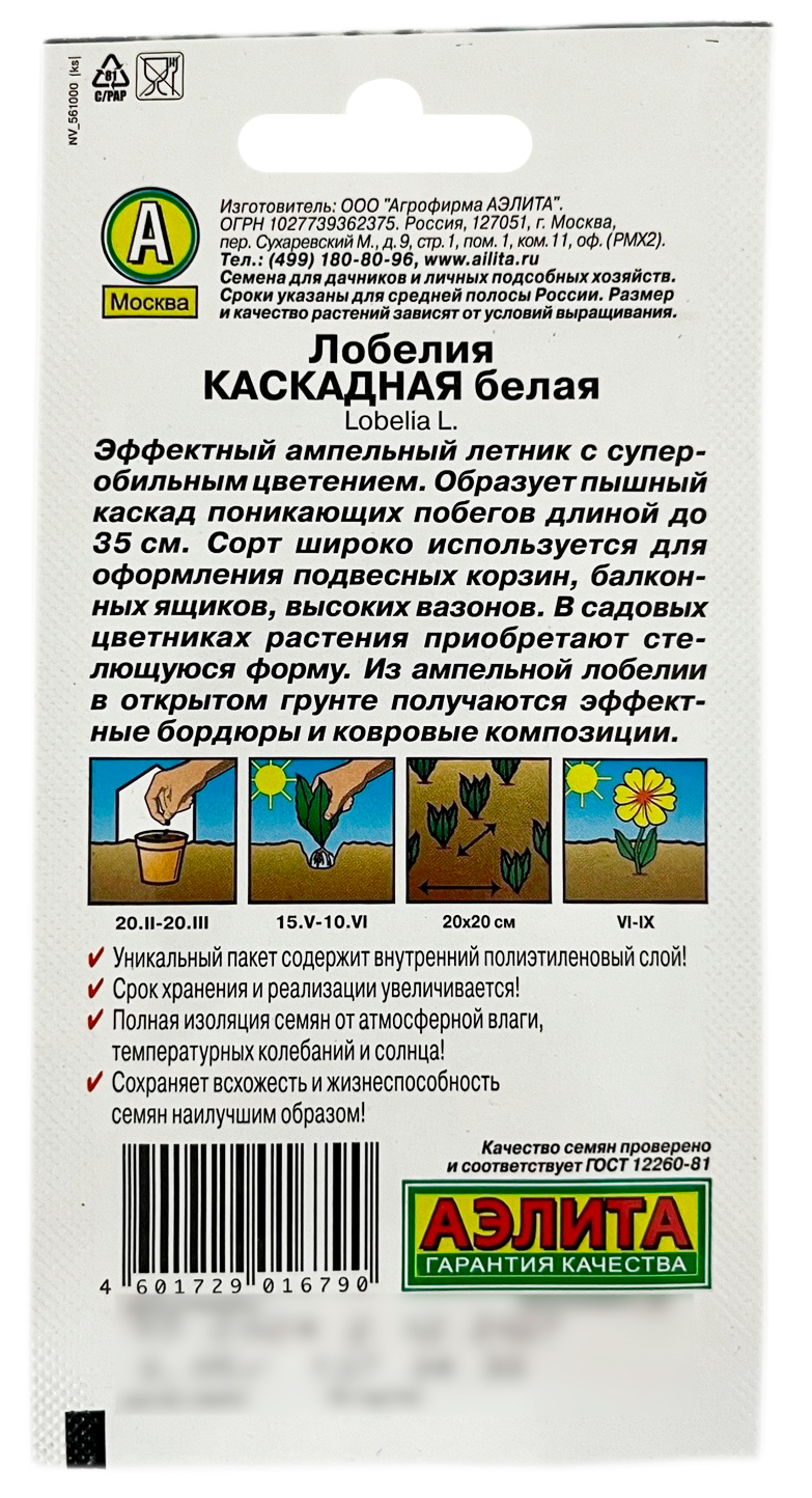 Лобелия каскадная белая АЭЛИТАЭффектный ампельный летник с суперобильным цветением. Образует пышный каскад поникающих побегов длиной до 35 см. Сорт широко используется для оформления подвесных корзин, балконных ящиков, высоких вазонов. В садовых цветниках растения приобретают стелющуюся форму. Из ампельной лобелии в открытом грунте получаются эффектные бордюры и ковровые композиции.