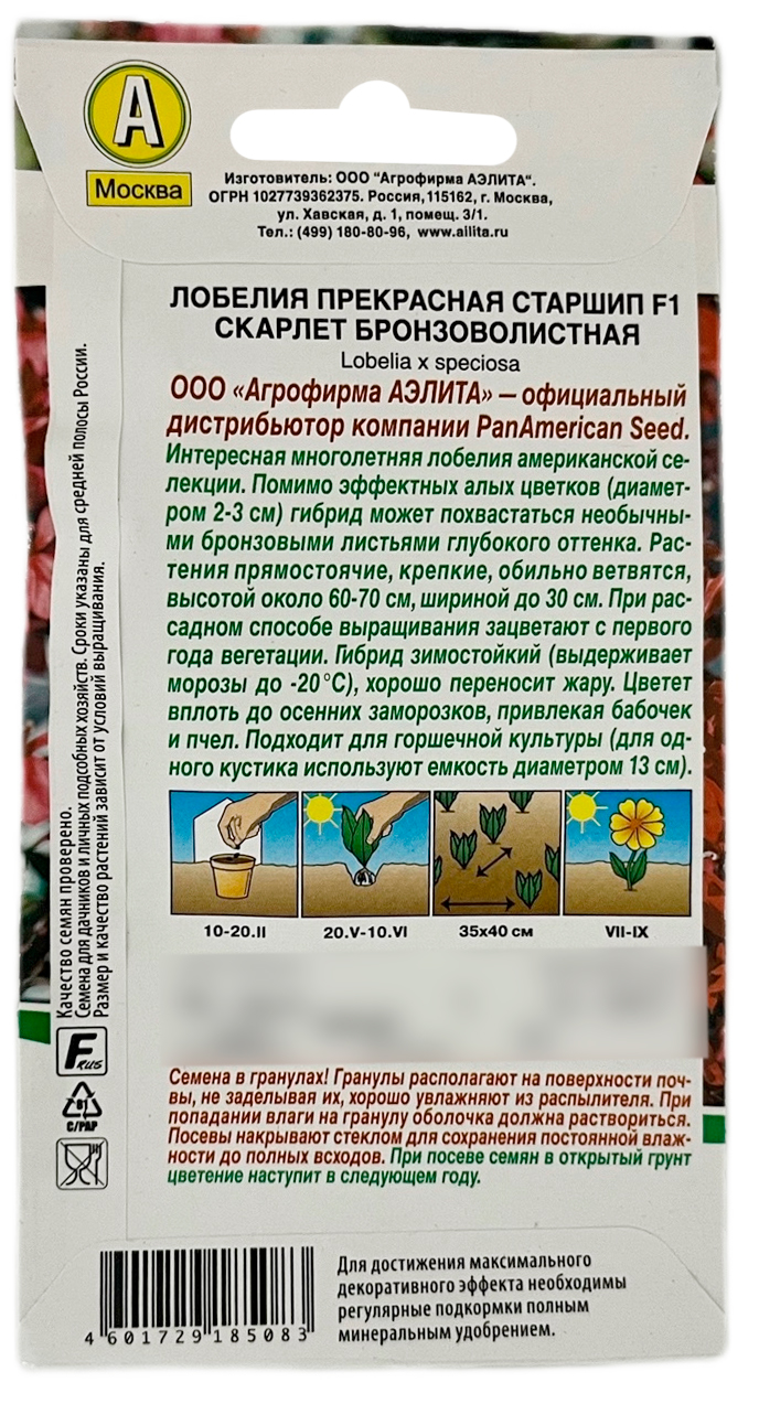 Лобелия прекрасная старшип СКАРЛЕТ БРОНЗОВОЛИСТНАЯ АЭЛИТАИнтересная многолетняя лобелия американской селекции. Помимо эффектных алых цветков (диаметром 2-3 см) гибрид может похвастаться необычными бронзовыми листьями глубокого оттенка. Растения прямостоячие, крепкие, обильно ветвятся, высотой около 60-70 см, шириной до 30 см. При рассадном способе выращивания зацветают с первого года вегетации. Гибрид зимостойкий (выдерживает морозы до -20 °С), хорошо переносит жару. Цвететвплоть до осенних заморозков, привлекая бабочек и пчел. Подходит для горшечной культуры (для одного кус тика используют емкость диаметром 13 см).