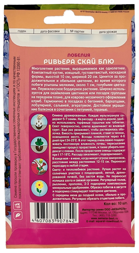Лобелия ривьера скай блю АКВАРЕЛЬМноголетнее растение, выращиваемое как однолетнее. Компактный кустик, изящный, густоветвистый, каскадной формы, высотой 10 см, шириной 20 см. Ценится за продолжительное и обильное цветение, во время которого побеги усыпаны мелкими, около 1 см, голубыми цветками. Первоклассное бордюрное растение. Широко используется для окаймления цветников или посадок группами на переднем плане, для коврово-мозаичного оформления клумб. Гармонично в посадках с бегонией, бархатцами, лобулярией, сальвией, агератумом. Достойное украшение балконов в сочетании с петунией, геранью.