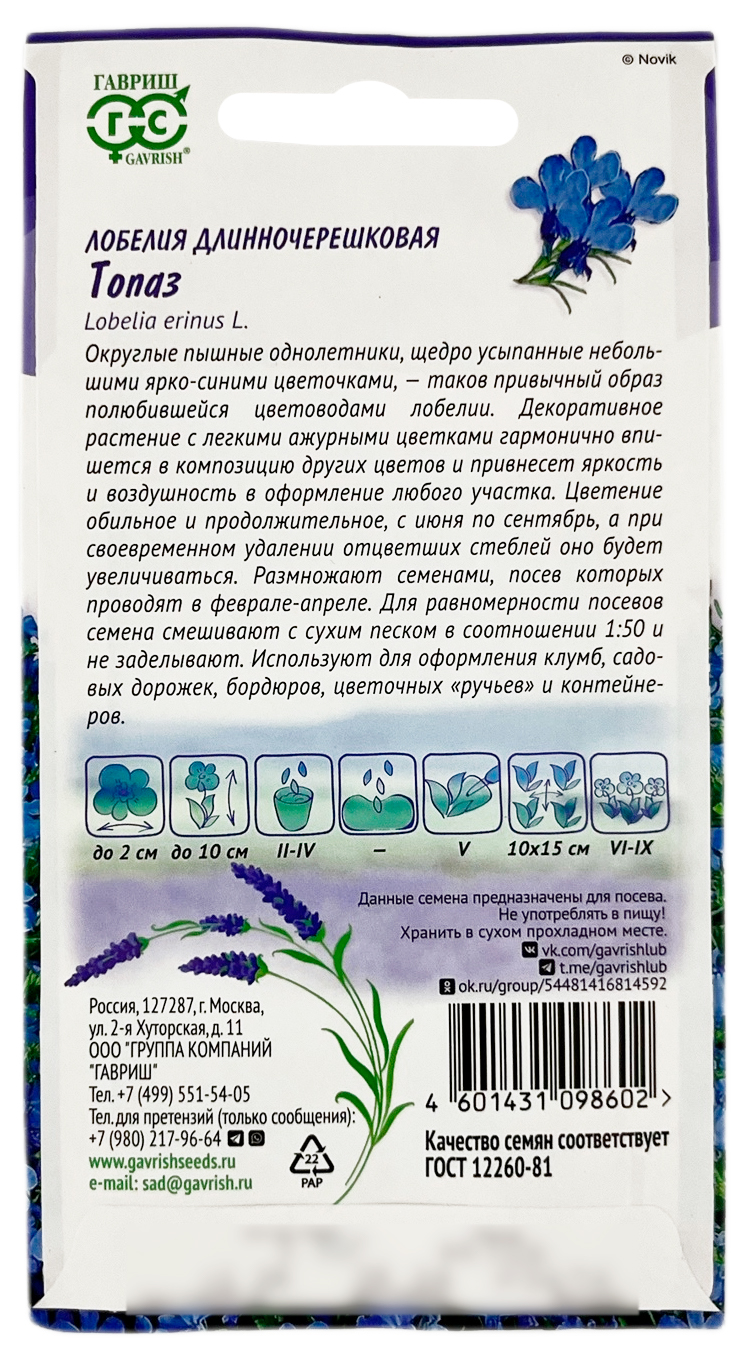 Лобелия длинночерешковая ТОПАЗ ГАВРИШОкруглые пышные однолетники, щедро усыпанные небольшими ярко-синими цветочками — таков привычный образ полюбившейся цветоводами лобелии. Декоративное растение с легкими ажурными цветками гармонично впишется в композицию других цветов и привнесет яркость и воздушность в оформление любого участка. Цветение обильное и продолжительное, с июня по сентябрь, а при своевременном удалении отцветших стеблей оно будет увеличиваться. Размножают семенами, посев которых производят в феврале-апреле. Для равномерности посевов семена смешивают с сухим песком в соотношении 1:50 и не заделывают. Используют для оформления клумб, садовых дорожек, бордюров, цветочных «ручьев» и контейнеров.