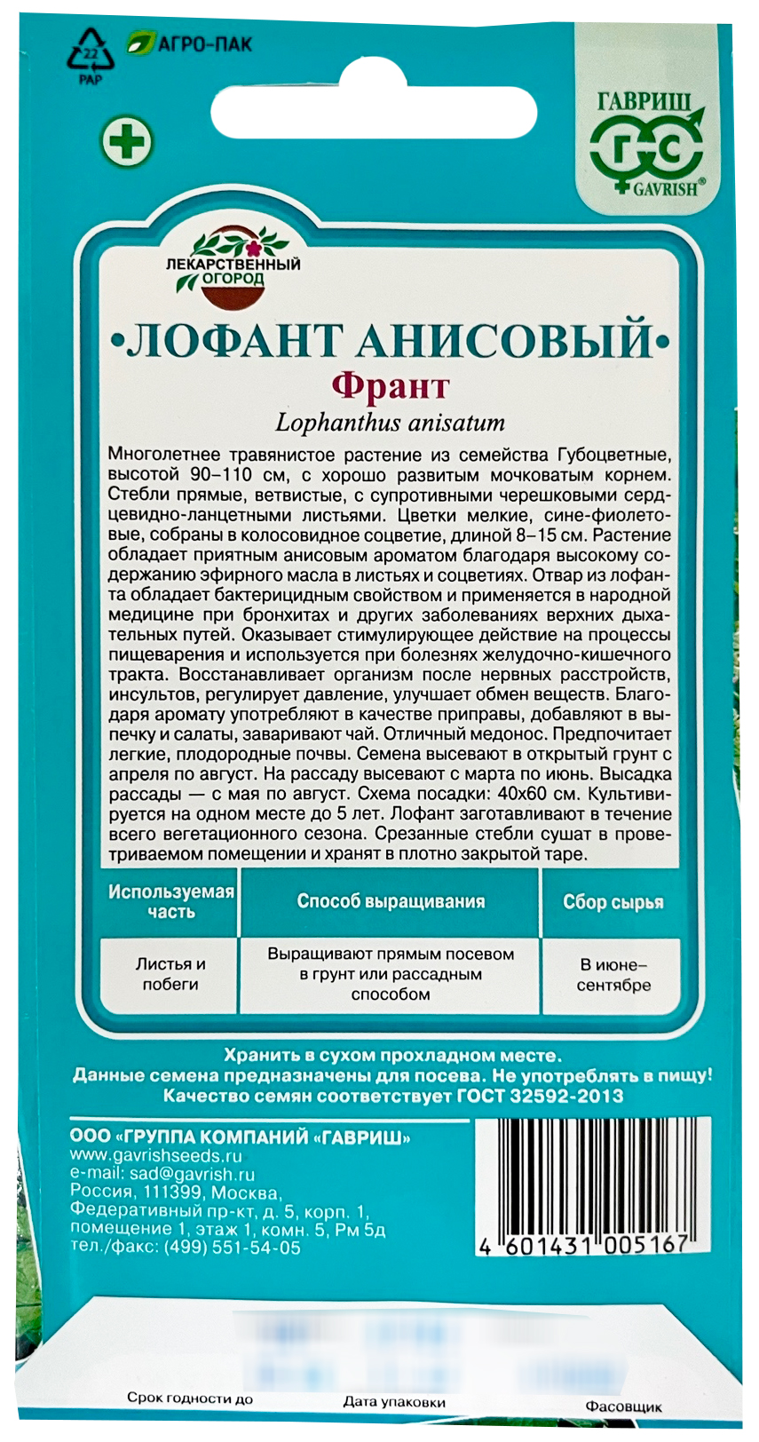 Лофант анисовый Франт ГАВРИШМноголетнее травянистое растение из семейства Губоцветные, высотой 90-110 см, с хорошо развитым мочковатым корнем. Стебли прямые, ветвистые, с супротивными черешковыми сердцевидно-ланцетными листьями. Цветки мелкие, сине-фиолетовые, собраны в колосовидное соцветие, длиной 8-15 см. Растение обладает приятным анисовым ароматом благодаря высокому содержанию эфирного масла в листьях и соцветиях. Отвар из лофанта обладает бактерицидным свойством и применяется в народной медицине при бронхитах и других заболеваниях верхних дыхательных путей. Оказывает стимулирующее действие на процессы пищеварения и используется при болезнях желудочно-кишечного тракта. Восстанавливает организм после нервных расстройств, инсультов, регулирует давление, улучшает обмен веществ. Благодаря аромату употребляют в качестве приправы, добавляют в выпечку и салаты, заваривают чай. Отличный медонос. Предпочитает легкие, плодородные почвы. Семена высевают в открытый грунт с апреля по август. На рассаду высевают с марта по июнь. Высадка рассады - с мая по август. Схема посадки: 40х60 см. Культивируется на одном месте до 5 лет. Лофант заготавливают в течение всего вегетационного сезона. Срезанные стебли сушат в проветриваемом помещении и хранят в плотно закрытой таре.