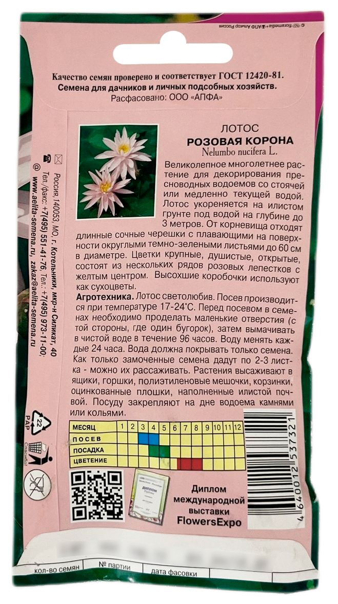 Лотос розовая корона АЭЛИТА серия ЦВЕТУЩИЙ САДВеликолепное многолетнее растение для декорирования пресноводных водоемов со стоячей или медленно текущей водой. Лотос укореняется на илистом грунте под водой на глубине до 3 метров. От корневища отходят длинные сочные черешки с плавающими на поверхности округлыми темно-зелеными листьями до 60 см в диаметре. Цветки крупные, душистые, открытые, состоят из нескольких рядов розовых лепестков с желтым центром. Высохшие коробочки используют как сухоцветы.