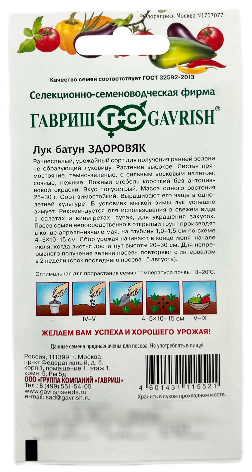 Лук батун ЗДОРОВЯК ГАВРИШРаннеспелый, урожайный сорт для получения ранней зелени не образующий луковицу. Растение высокое. Листья прямостоячие, темно-зеленые, с сильным восковым налетом, сочные, нежные. Ложный стебель короткий без антоциановой окраски. Вкус полуострый. Масса одного растения 25–30 г. Сорт зимостойкий. Выращивают его чаще в однолетней культуре. В условиях мягкой зимы лук успешно зимует. Рекомендуется для использования в свежем виде в салатах и винегретах, супах, для украшения закусок. Посев семян непосредственно в открытый грунт производят в конце апреля - начале мая, на глубину 1,0-1,5 см по схеме 4-5 х 10-15 см. Сбор урожая начинают в конце июня — начале июля, когда листья достигнут высоты 20-30 см. Для непрерывного получения зелени посевы повторяют с интервалом в 2 недели (срок последнего посева 15 августа).