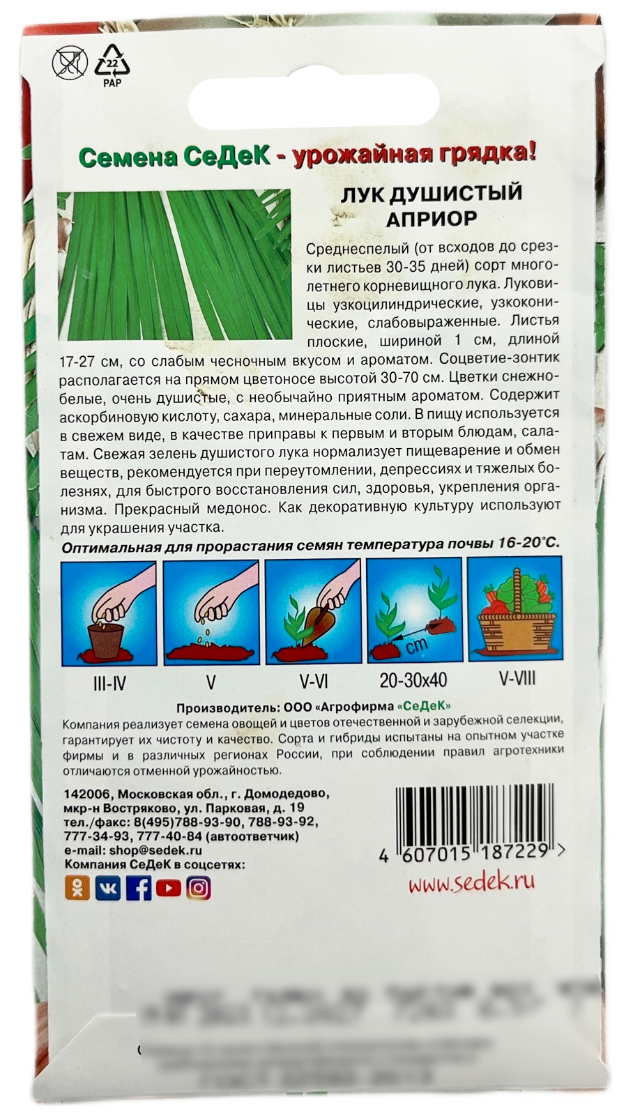 Лук душистый АПРИОР СеДеКСреднеспелый (от всходов до срезки листьев 30-35 дней) сорт многолетнего корневищного лука Луковицы узкоцилиндрические, узкоконические, слабо выраженные. Листья плоские, шириной 1 см, длиной 17-27 см, со слабым чесночным вкусом и ароматом. Соцветие-зонтик, располагается на высоком прямом цветоносе, высотой 30-70 см. Цветки снежно-белые, очень душистые, с необычайно приятным ароматом. Содержит аскорбиновую кислоту, сахара, минеральные соли. В пищу используется в свежем виде, в качестве приправы к первым и вторым блюдам, салатам. Свежая зелень душистого лука нормализует пищеварение и обмен веществ, рекомендуют при переутомлении, депрессиях и тяжёлых болезней, для быстрого восстановления сил и здоровья, и укрепления организма. Прекрасный медонос. Как декоративная культура используется для украшения участка.