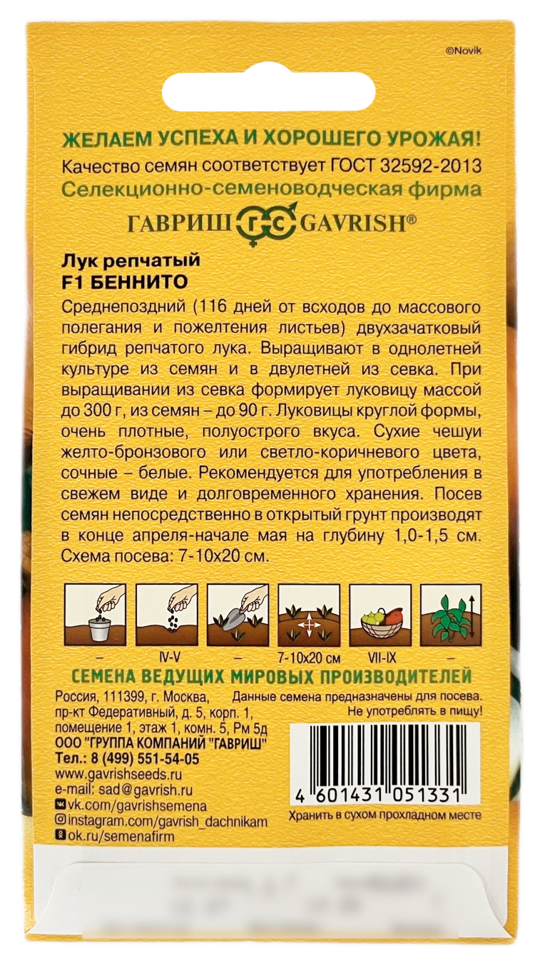 Лук репчатый F1 БЕННИТО ГАВРИШСреднепоздний (116 дней от всходов до массового полегания и пожелтения листьев) двухзачатковый гибрид репчатого лука. Выращивают в однолетней культуре из семян и в двулетней из севка. При выращивании из севка формирует луковицу массой до 300 г, из семян — до 90 г. Луковицы круглой формы, очень плотные, полуострого вкуса. Сухие чешуи желто-бронзового или светло-коричневого цвета, сочные — белые. Рекомендуется для употребления в свежем виде и для долговременного хранения. Посев семян непосредственно в открытый грунт производят в конце апреля — начале мая, на глубину 1,0-1,5 см. Схема посева: 7-10x20 см.