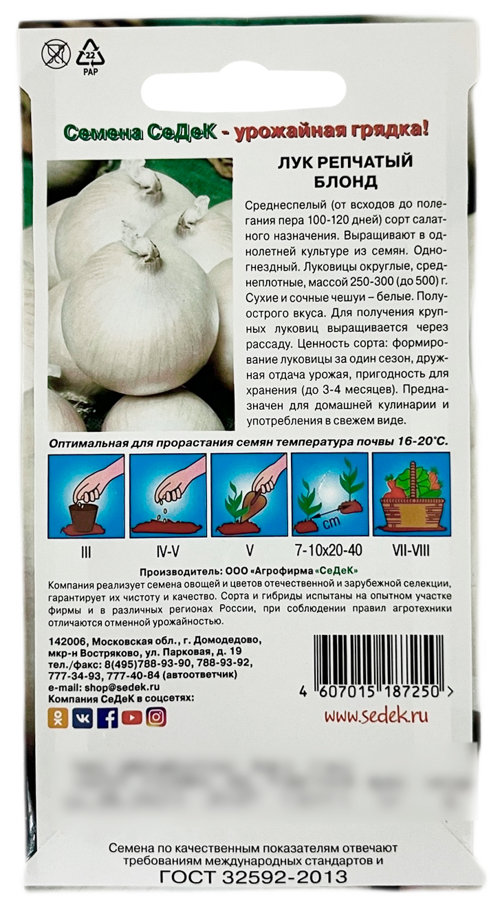 Лук репчатый БЛОНД СеДеКСреднеспелый (от всходов до полегания пера 100-120 дней) сорт салатного назначения. Выращивают в однолетней культуре из семян. Одногнёздный. Луковицы округлые, среднеплотные, массой 250-300 до 500 г. Сухие и сочные чешуи – белые. Полуострого вкуса. Для получения крупных луковиц выращивается через рассаду. Ценность сорта: формирование луковицы за один сезон, дружная отдача урожая, пригодность для хранения до 3-4 месяцев. Предназначен для употребления в свежем виде и в домашней кулинарии.