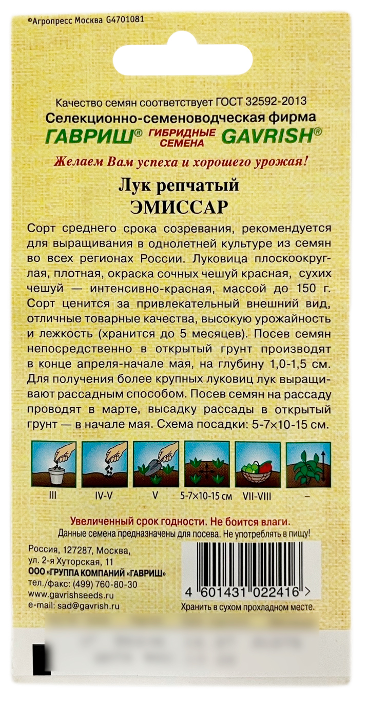 Лук репчатый ЭМИССАР ГАВРИШСорт среднего срока созревания. Отличатся высокой пластичностью, пригоден для выращивания во всех регионах России. Рекомендуется для выращивания в однолетней культуре из семян на садово-огородных участках, в приусадебных и фермерских хозяйствах. Посев семян непосредственно в открытый грунт производят в конце апреля - начале мая, на глубину 1,0-1,5 см. Для получения более крупных луковиц лук выращивают рассадным способом. Посев семян на рассаду проводят в марте, высадку рассады в открытый грунт - в начале мая. Луковица имеет плоскоокруглую форму, плотная, окраска сухих чешуй интенсивно-красная. Сорт ценится за презентабельный внешний вид, отличные товарные качества, высокую урожайность и лежкоспособность. Пригоден для хранения не менее 5 месяцев.