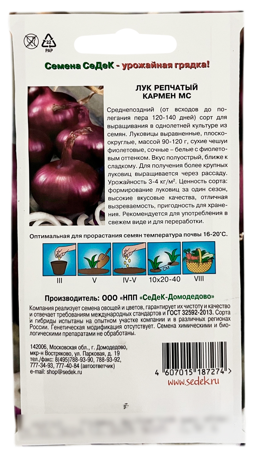 Лук репчатый КАРМЕН МС СеДеКСреднепоздний (от всходов до полегания пера 120-140 дней) сорт для выращивания в однолетней культуре из семян. Луковицы выравненные, плоскоокруглые, массой 90-120 г, сухие чешуи фиолетовые, сочные – белые с фиолетовым оттенком. Вкус полуострый, ближе к сладкому. Для получения более крупных луковиц выращивается через рассаду. Урожайность 3-4 кг/м². Ценность сорта: формирование луковиц за один сезон, высокие вкусовые качества, отличная вызреваемость, пригодность для хранения. Рекомендуется для употребления в свежем виде и переработки.