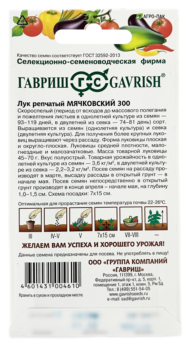 Лук репчатый МЯЧКОВСКИЙ 300 ГАВРИШСкороспелый (75-120 дней от всходов до массового полегания и пожелтения листьев) сорт. Выращивается из семян (однолетняя культура) и севка (двулетняя культура). Посев семян на рассаду производят в марте, высадку рассады в открытый грунт – в начале мая. Посев семян непосредственно в открытый грунт производят в конце апреля - начале мая, на глубину 1,0-1,5 см. Форма луковицы плоская и округло-плоская. Луковицы средней плотности, малогнездные и малозачатковые. Масса товарной луковицы 41-69 г. Вкус полуострый. Товарная урожайность в однолетней культуре из семян 2,0 кг/м2 , в двулетней культуре из севка 2,2-3,2 кг/м2. Схема посадки 5-7x10-15 см.