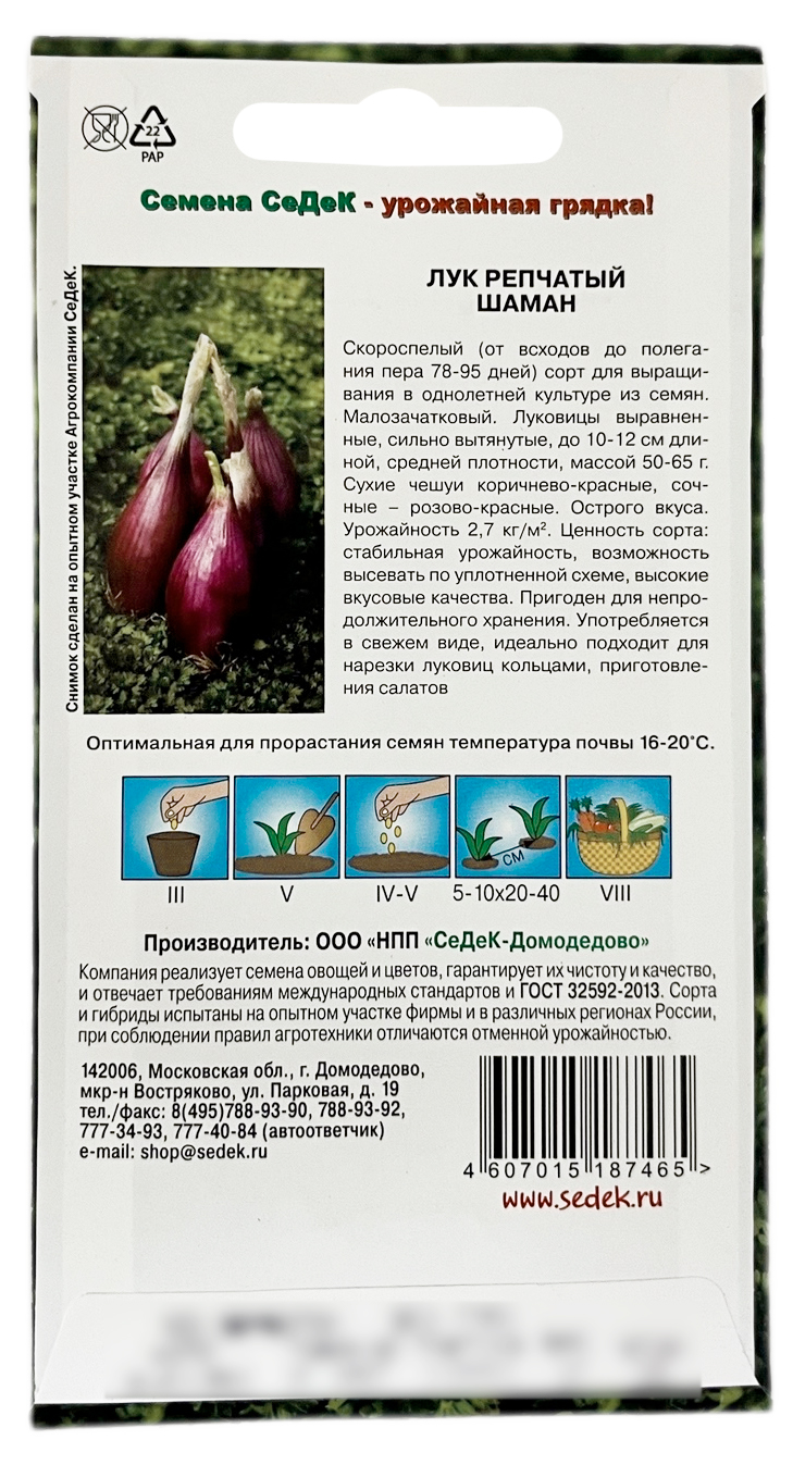 Лук репчатый ШАМАН СеДеКСкороспелый (от всходов до полегания пера 78-95 дней) сорт для выращивания в однолетней культуре из семян. Малозачатковый. Луковицы выравненные, сильно вытянутые, до 10-12 см длиной, средней плотности, массой 50-65 г. Сухие чешуи коричнево-красные, сочные – розово-красные. Острого вкуса. Урожайность 2,7 кг/м2. Ценность сорта: стабильная урожайность, возможность высевать по уплотненной схеме, высокие вкусовые качества. Пригоден для непродолжительного хранения. Употребляется в свежем виде, идеально подходит для нарезки луковиц кольцами, приготовления салатов.