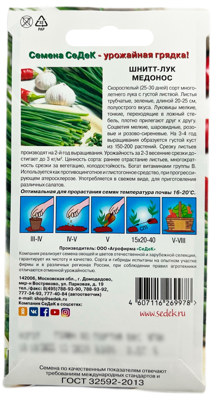 Лук шнитт Медонос СеДеКСкороспелый (25-30 дней) сорт многолетнего лука с густой листвой. Листья трубчатые, зелёные, длиной 20-25 см, полуострого вкуса. Луковицы мелкие, переходящие в ложный стебель, плотно прилегают друг к другу. Соцветия мелкие, шаровидные, розовые и розово-сиреневые. На 3-4 год выращивания образуется густой куст из 150-200 растений. Срезку листьев производят на 2-й год выращивания. Урожайность за 2-3 весенние срезки достигает до 3 кг/м2. Ценность сорта: раннее отрастание листьев, многократность срезки за вегетацию, холодостойкость. Богат витаминами группы В. Используется как противоцинготное и глистогонное средство, при прогрессирующем атеросклерозе. Употребляется в свежем виде, для приготовления различных салатов.