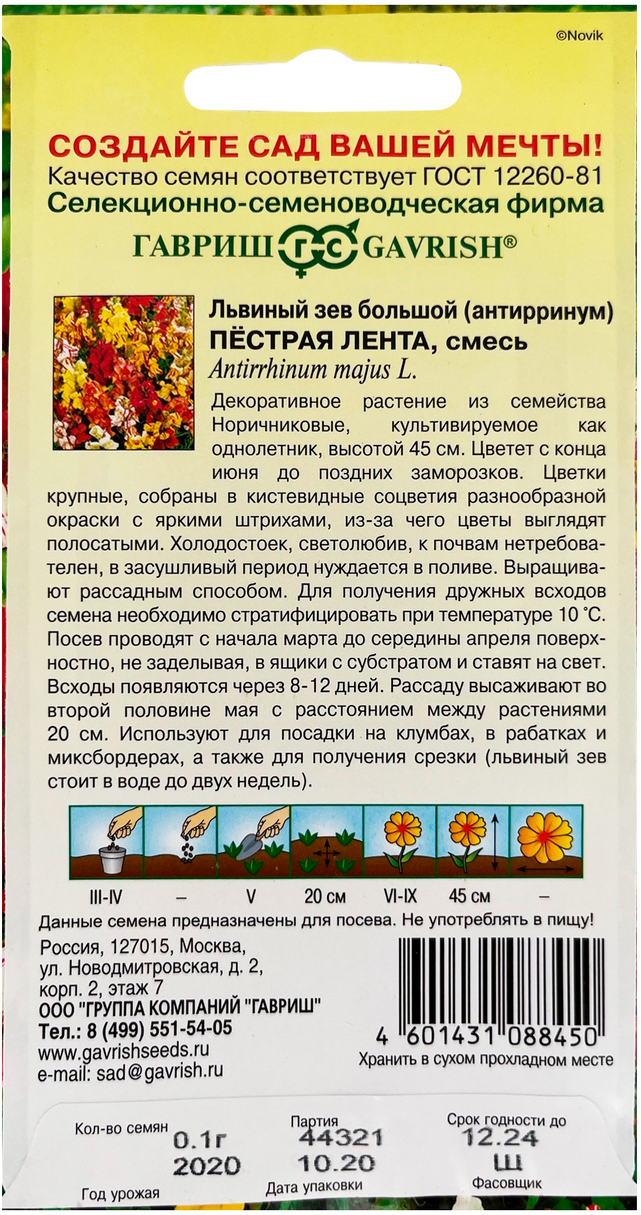 Антирринум (Львиный зев) Пестрая лента 0,05 г Н21Декоративное растение из семейства Норичниковые, культивируемое как однолетник, высотой 45 см. Цветет с конца июня до поздних заморозков. Цветки крупные, собраны в кистевидные соцветия разнообразной окраски с яркими вкраплениями, из-за чего цветы выглядят полосатыми. Холодостоек, светолюбив, к почвам нетребователен, в засушливый период нуждается в поливе. Выращивают рассадным способом. Для получения дружных всходов семена необходимо стратифицировать при температуре +10оС. Посев проводят с начала марта до середины апреля, поверхностно, не заделывая, в ящики с субстратом и ставят на свет. Всходы появляются через 8-12 дней. Рассаду высаживают во второй половине мая с расстоянием между растениями 20 см. Используется для посадки на клумбах, в рабатках и миксбордерах, а также для получения срезки (львиный зев стоит в воде до двух недель).