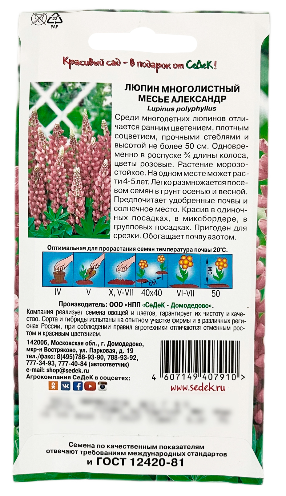 Люпин многолистный МЕСЬЕ АЛЕКСАНДР СеДеКСреди многолетних люпинов отличается ранним цветением, плотным соцветием, прочными стеблями и высотой не более 60 см. Одновременно в роспуске ¾ длины колоса, цветы розовые. Растение – морозостойкое. На одном месте может расти 4-5 лет. Легко размножается посевом семян в грунт осенью и весной. Предпочитает удобренные почвы и солнечное место. Красив в одиночных посадках, в миксбордере, в групповых посадках. Пригоден для срезки. Обогащает почву азотом.