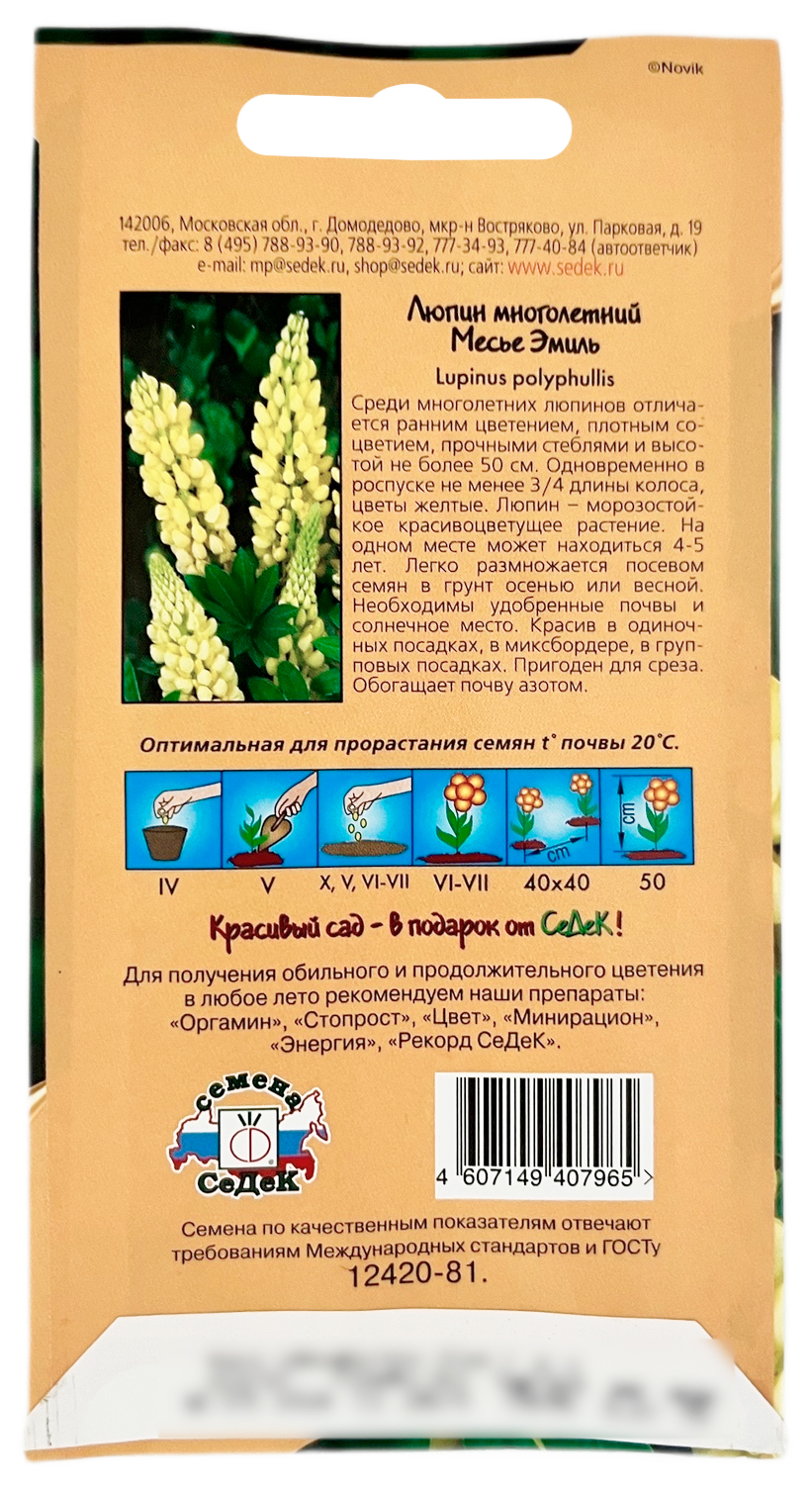 Люпин многолетний МЕСЬЕ ЭМИЛЬ СеДеКСреди многолетних люпинов серия Gallery отличается ранним цветением, плотным соцветием, прочными стеблями и высотой не более 50см. Одновременно в роспуске не менее 3/4 длины колоса, цветы желтые. Люпин - морозостойкое красивоцветущее растение. На одном месте может находиться 4-5 лет. Легко размножается посевом семян в грунт осенью или весной. Необходимы удобренные почвы и солнечное место. Красив в одиночных посадках, в миксбордере, в групповых посадках. Пригоден для среза. Обогащает почву азотом.