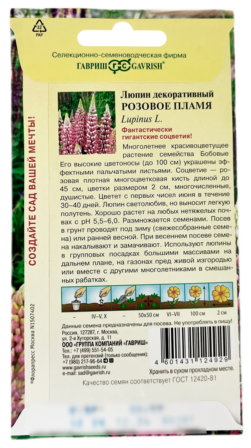 Люпин декоративный РОЗОВОЕ ПЛАМЯ ГАВРИШМноголетнее красивоцветущее растение семейства Бобовые Его высокие цветоносы (до 100 см) украшены эффектными пальчатыми листьями. Соцветие —розовая плотная многоцветковая кисть длиной до 45 см, цветки размером 2 см, многочисленные, душистые. Цветет с первых чисел июня в течение 30-40 дней. Люпин светолюбив, но выносит легкую полутень. Хорошо растет на любых нетяжелых почвах с рН 5,5-6,0. Размножается семенами. Посев в грунт проводят под зиму (свежесобранные семена) или ранней весной. При весеннем посеве семена накалывают и замачивают. Используют люпины в групповых посадках большими массивами на дальнем плане, на газонах пред живой изгородью или вместе с другими многолетниками в смешанных рабатках.