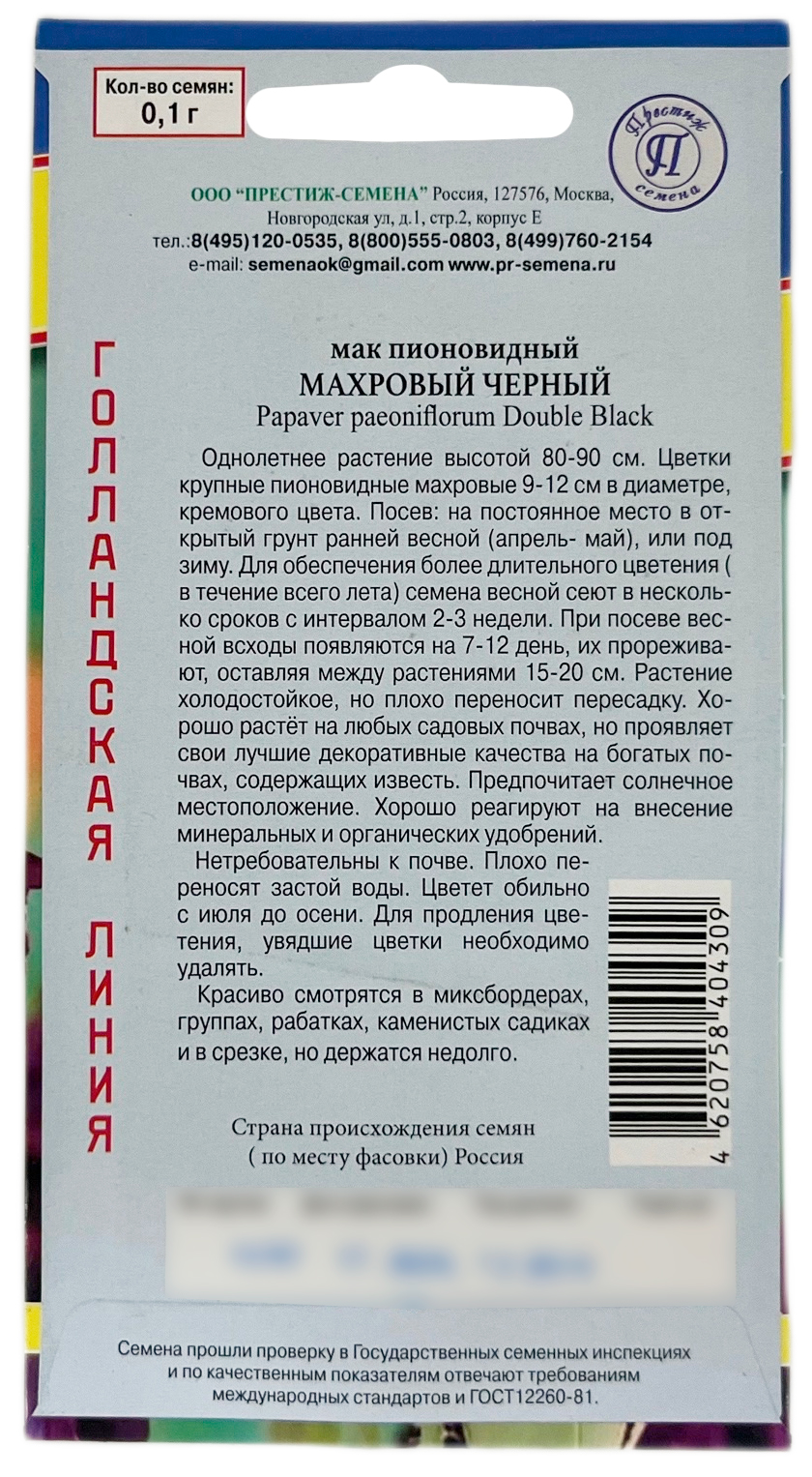 Мак пионовидный махровый черный ПРЕСТИЖОднолетник. Высота растения - 80 см. Диаметр цветка - 11-12 см. Красиво смотрятся в миксбордерах, рабатках, каменистых садиках и в срезке, но держатся недолго. Высевают мак ранней весной или поздней осенью (при установлении стабильных холодов, чтобы до зимы семена не успели проклюнуться). Мак может прорасти уже при +2…+3 градусов, но массовое прорастания семян и быстрое развитие сеянцев мака происходит при температуре 20-25 градусов. Глубина заделки семян составляет 2-3 мм. Весной всходы мака появляются через 1-2 недели после посева. Маки легко переносят кратковременные заморозки (до -4 градусов). Растения светолюбивы, поэтому нуждаются в регулярной прополке.